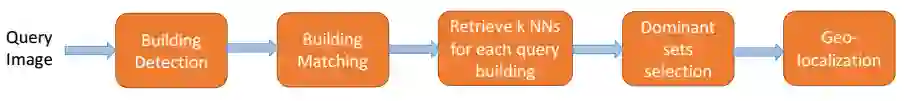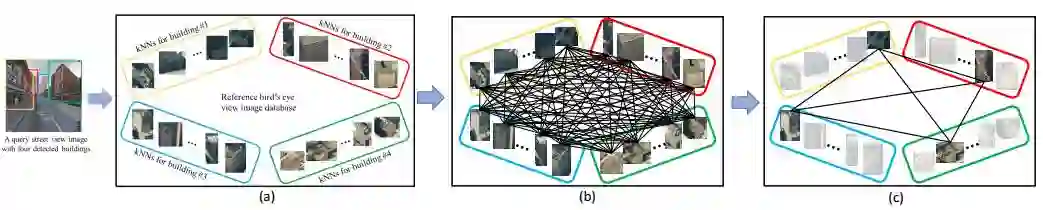 其次,对于待查询图像中的每个建筑物(下图最左4个检测框,代表4个建筑),我们使用训练好的Siamese网络(包含正匹配对和负匹配对)在参考建筑物中检索K最近邻(下图a中,4个聚类集合对应了待查询图像中4个建筑)。为让每个待查询建筑找到正确的最近邻,我们开发一个基于优势集(Dominant Set)的高效多个最近邻匹配方法(下图b)。这种方法同时考虑了全局相似和局部相似,最终用最优选取的4个建筑GPS平均值代表该查询图像的GPS位置(下图c)。