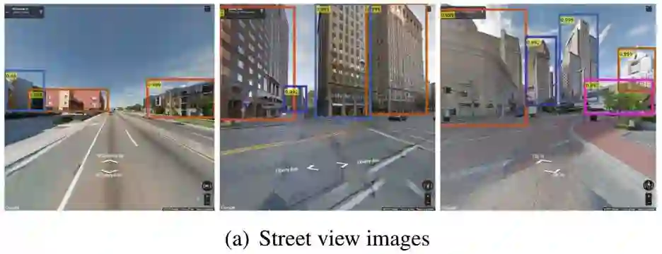 首先,采用Faster R-CNN[16]在待查询图像和参考图像中检测建筑物(下图颜色框)。