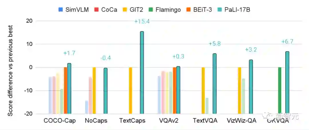 在WebLI上预训练的PaLI模型在多个图像和语言基准上取得了最先进的性能,如COCO-Captions、TextCaps、VQAv2、OK-VQA、TextVQA等等,也超越了先前模型的多语言视觉描述(multilingual visual captioning)和视觉问答的基准。