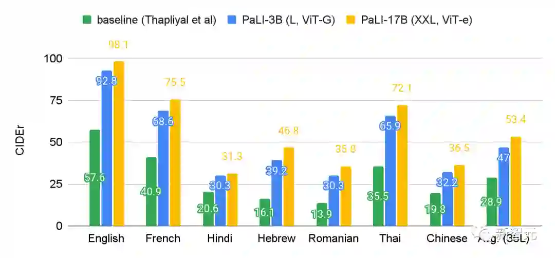 在35种语言的基准Crossmodal-3600上评估了PaLI后可以发现多语言起标题任务从PaLI模型的扩展中受益更多。