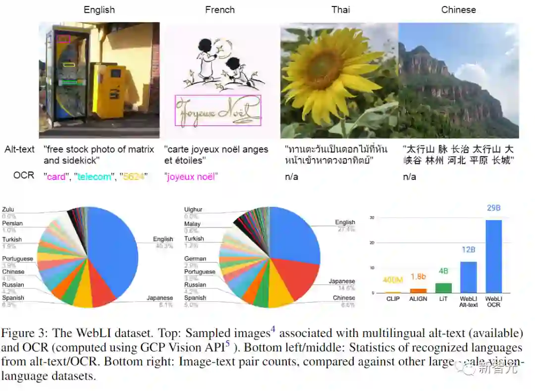 模型的训练使用的是一个公开的图像集合,其中包括自动爬取的109种语言的标注,文中也称之为WebLI数据集。