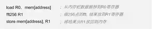 对专用处理器来说,指令集的设计直接反映了对应用需求的理解。比如,第一篇中介绍的例子,如果我们的专用处理器只是为了加速256点的FFT用的,那么指令集里只有FFT指令就够用了。考虑到数据搬移的需求,再加上几条数据搬移的指令,比如读取数据,写回数据。于是可以得到一个有三条指令的指令集(fft,load,store)。这个处理器执行的汇编(Assembly)程序大概就是这样的。