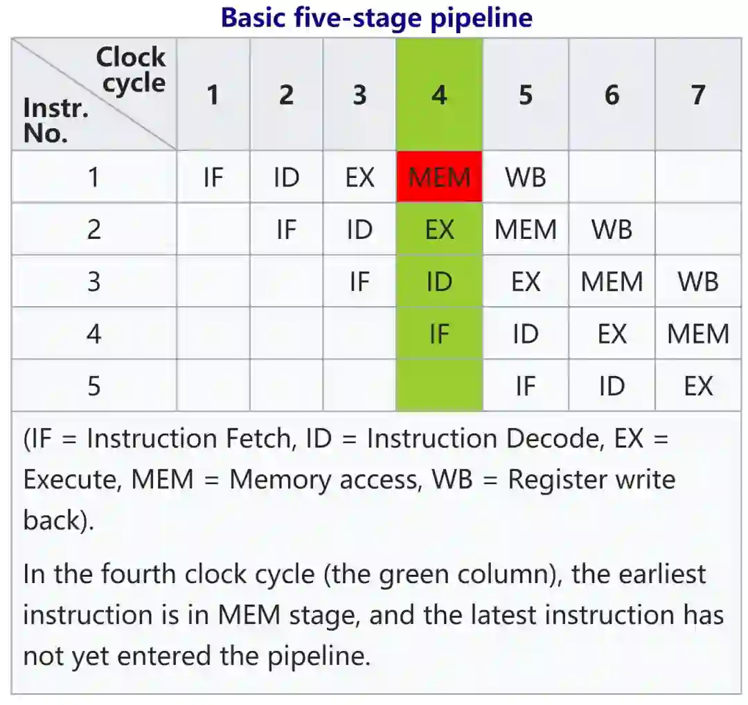 当一条指令,完成了“取指”操作,开始进行“译码”的时候,取指模块就可以取下一条指令了,这样可以让这些模块不至于闲着没用。wiki对指令流水线的示例如下(IF:取指;ID:指令译码;EX:执行;MEM:访存;WB:写回):