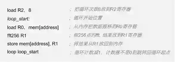 当然,这里做了很多简化,但看起来这个指令集已经可以work了。同时,这也是一个“高效”的设计,没有多余的东西。如果你要循环做8次fft,那么可能需要增加一条loop(循环)指令,要不然你就得把上面的代码copy八次。加了loop指令,汇编代码可能是下面这样。