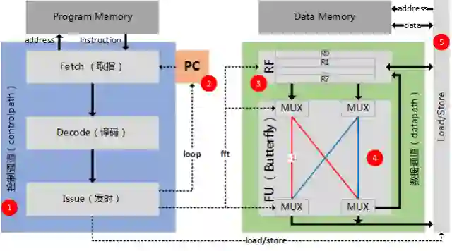 首先,我们要执行的关键指令是fft指令,这里假设fft指令就是做一次蝶形运算(buffterfly)。所以我们要有一个做蝶形运算的硬件单元(图中的4)。而这个功能单元FU(Functional Unit)需要输入和输出数据。数据了来源可能是通用寄存器堆RF(Register File,图中的3),也可能是memory或者流水线寄存器。同样,数据的输出也有很多可能。因此,需要一些MUX来进行选择。简单说,图中的3和4就构成了处理器中的数据通道(datapath),也就是处理数据的通路。另外,为了把数据从数据存储器(data memory)中读进来进行处理(load),或者将处理的结果再写回到存储器,还需要一个“load store单元”(图中的5)。