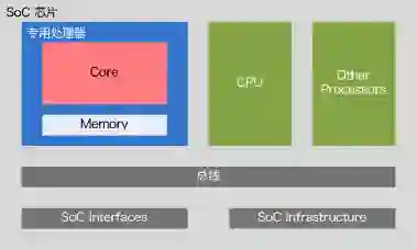 由于专用处理器这个名称可以用在很多地方,我想再明确一下本文说的专用处理器设计的范围:1. 我们主要讨论IP级的设计,也就是说专用处理器设计最终作为一个SoC(System-on-Chip)芯片中的IP出现。它需要和其它模块合作完成整个芯片要实现的功能(下图为一个简化模型)。2. 我们主要讨论的专用处理器是要运行程序的,有自己的指令集(可能很简单,比如Google第一代TPU,主要指令不超过10条),需要有存储程序的空间和读取指令,执行指令的机制。