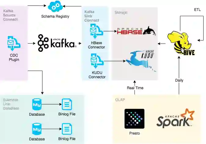 我们早期使用的 canal 同步 binlog 到 Kafka 中,但是在我们选型的时候,canal 还是主从结构,嵌入到 Kafka connect 中不是很方便;现在来看 Debezium 也是个不错的选择,不过在选型的时候,它还没发布正式版本,当时也没有选择。最终我们选择了Maxwell,一个比较小巧的工具改造起来比较方便,也便于嵌入 Kafka connect。