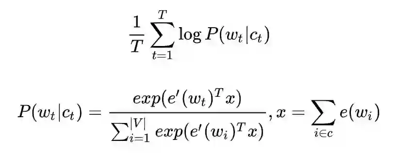 对于 CBOW 而言,我们可以从它的名字上一窥究竟,它的全称是 Continuous Bag-of-Words,也就是连续的词袋模型,为什么取这个名字,先来看看它的目标函数。