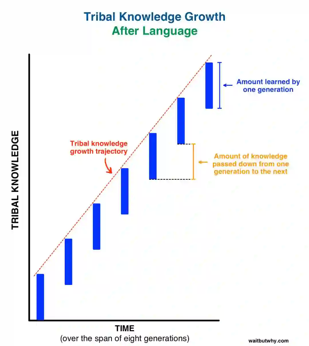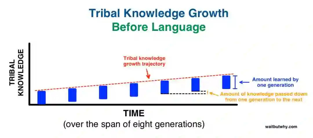不过,我觉得 Urban 想说却并没有说出来的是,即便在人类语言诞生之前,人类祖先也可以通过可能已经先于语言而诞生的学习与认知能力,做到以“代”为单位来进行传承与进化,只不过不同于基因进化,这是一种地球生命全新的进化方式,在效率上已经比其他生物的进化效率高的多得多。