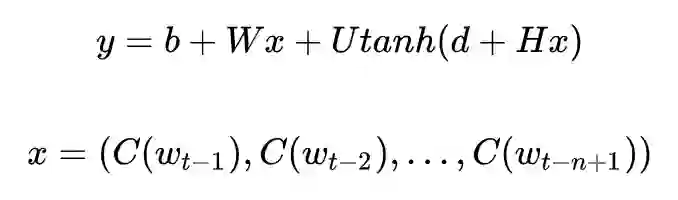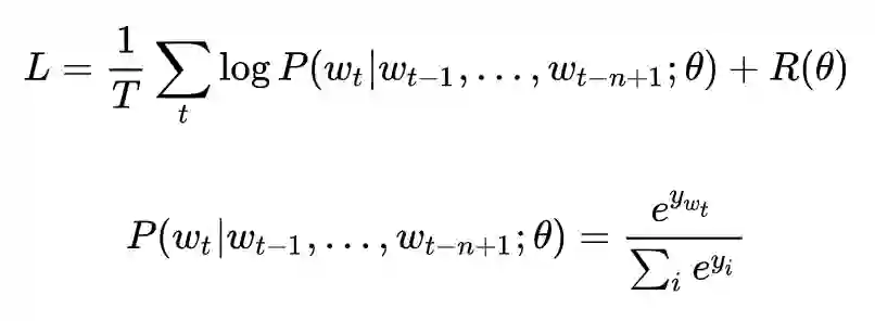 撇去正则化项,NNLM 的极大目标函数对数似然函数,其本质上是个 N-Gram 的语言模型,如下所示: