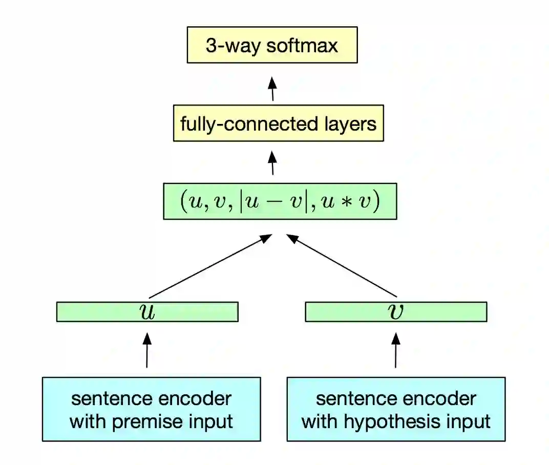 这个框架最底层是一个 Encoder,也就是最终要获取的句子向量提取器,然后将得到的句子向量通过一些向量操作后得到句子对的混合语义特征,最后接上全连接层并做 SNLI 上的三分类任务。
