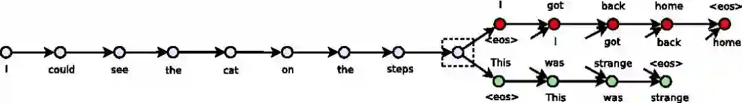 2015 年,多伦多大学的 Kiros 等人提出了一个很有意思的方法叫 Skip-thoughts。同样也是借鉴了 Skip-gram 的思想,但是和 PV-DBOW 中利用文档来预测词的做法不一样的是,Skip-thoughts 直接在句子间进行预测,也就是将 Skip-gram 中以词为基本单位,替换成了以句子为基本单位,具体做法就是选定一个窗口,遍历其中的句子,然后分别利用当前句子去预测和输出它的上一句和下一句。