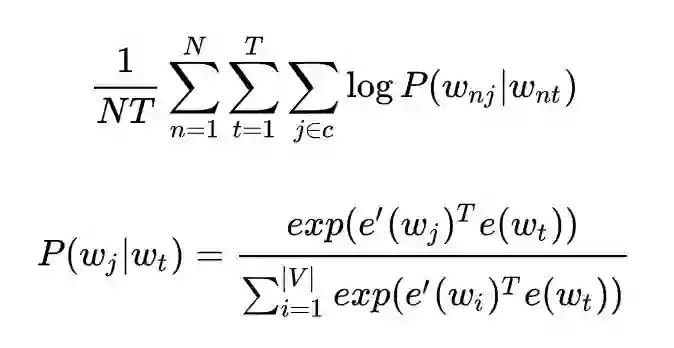 不过更有意思的还是,GloVe 和 word2vec 似乎有种更为内在的联系,再来看看他们的目标函数有什么不一样,这是 Skip-gram 的目标函数(这里在原来的基础上加上了对于语料的遍历 N):