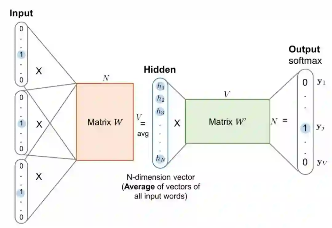 首先,CBOW 没有隐藏层,本质上只有两层结构,输入层将目标词语境 c 中的每一个词向量简单求和(当然,也可以求平均)后得到语境向量,然后直接与目标词的输出向量求点积,目标函数也就是要让这个与目标词向量的点积取得最大值,对应的与非目标词的点积尽量取得最小值。