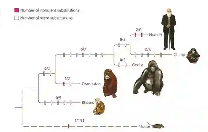 大约在 20 万年前,人类祖先 FOXP2 基因的 2 处(相对于其他原始猿类,如下图)极其微小却又至为关键的突变,让人类祖先逐渐拥有了语言能力,从此人类逐渐走上了一条不同于其他所有动物的文明演化之路。