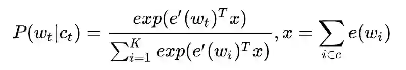接着,Mikolov 又提出了负采样的思想,而这一思想也是受了 C&W 模型中构造负样本方法启发,同时参考了 Noise Contrastive Estimation (NCE) 的思想,用 CBOW 的框架简单来讲就是,负采样每遍历到一个目标词,为了使得目标词的概率 P(wt|ct) 最大,根据 softmax 函数的概率公式,也就是让分子中的最大,而分母中其他非目标词的