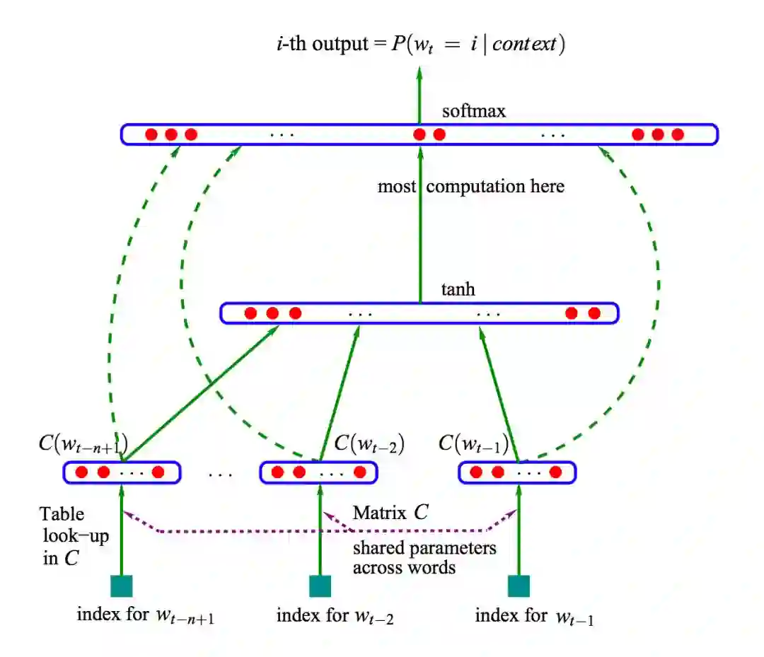 这些缺点的存在,迫使 2003 年 Bengio 在他的经典论文 A Neural Probabilistic Language Model 中,首次将深度学习的思想融入到语言模型中,并发现将训练得到的 NNLM(Neural Net Language Model,神经网络语言模型)模型的第一层参数当做词的分布式表征时,能够很好地获取词语之间的相似度。