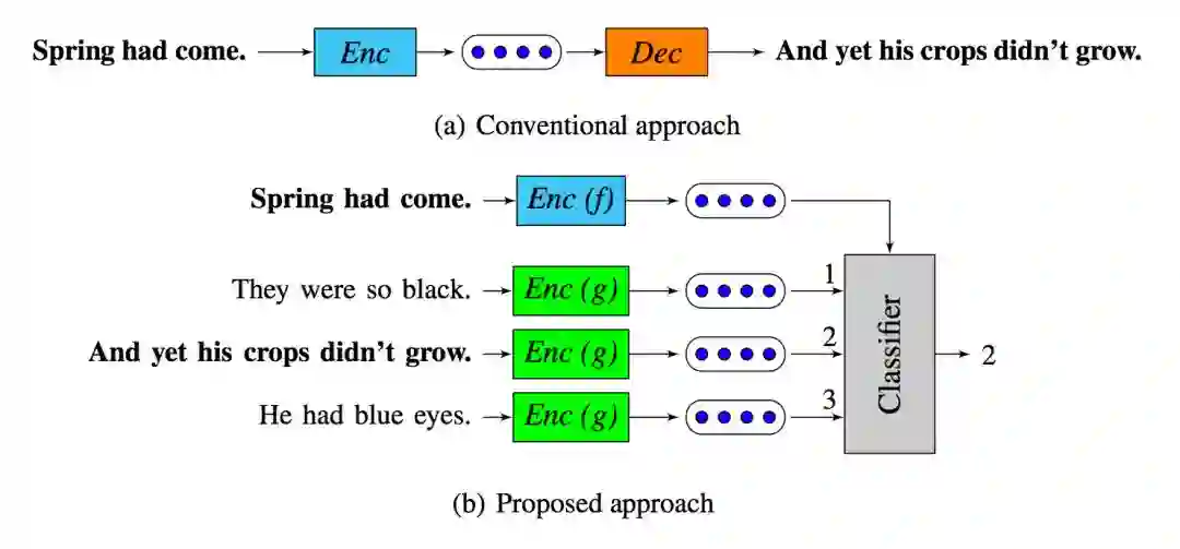 2018 年的时候,在 Skip-thoughts 的基础上,Google Brain 的 Logeswaran 等人将这一思想做了进一步改进,他们认为 Skip-thoughts 的 Decoder 效率太低,且无法在大规模语料上很好的训练(这是 RNN 结构的通病)。