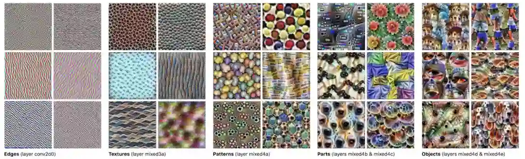 不过为何这种预训练的模式能够有效?这背后有什么更深刻的内涵吗?为此,Google Brain 团队将 2014 年的 ImageNet 冠军 GoogleNet 的中间层进行了可视化,可以发现模型的较低层学习到的主要是物体的边缘,往高层后逐步就变成了成型的物体了。一般来说,物体的边缘和纹路都是一些比较通用的视觉特征,因此将这一部分对应的模型参数用来初始化 task-specific 模型中的参数,意味着模型就不需要再从头开始学习这些特征,从而大大提升了训练效率和性能。