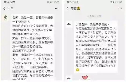 在这样的模式下,文案训练营的同学们,学完知识内容后→进行对应的练习→练习后及时收到专业的反馈,如此循环4周时间,小白想不大幅提升文案能力都难!