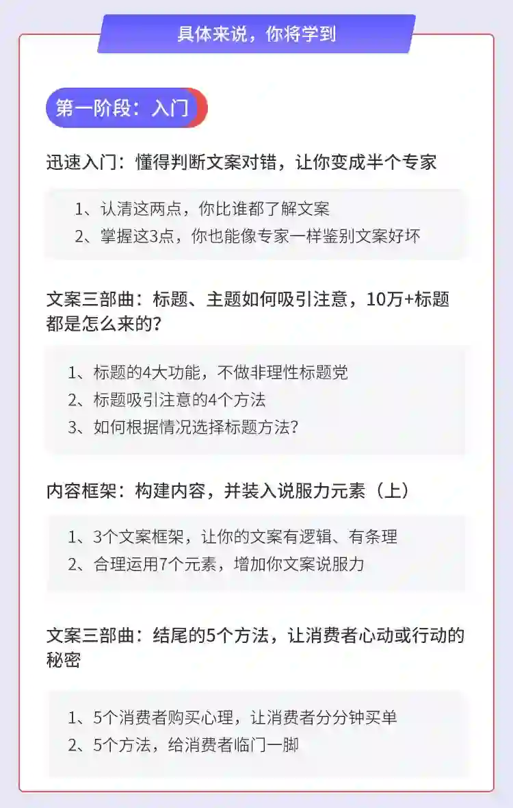 学完第一阶段,你的收获:你将对文案有自己的评价标准,获得标题写作的具体框架、懂得如何写文案,写出让人有信任感的文案,懂得如何结尾才能让用户行动