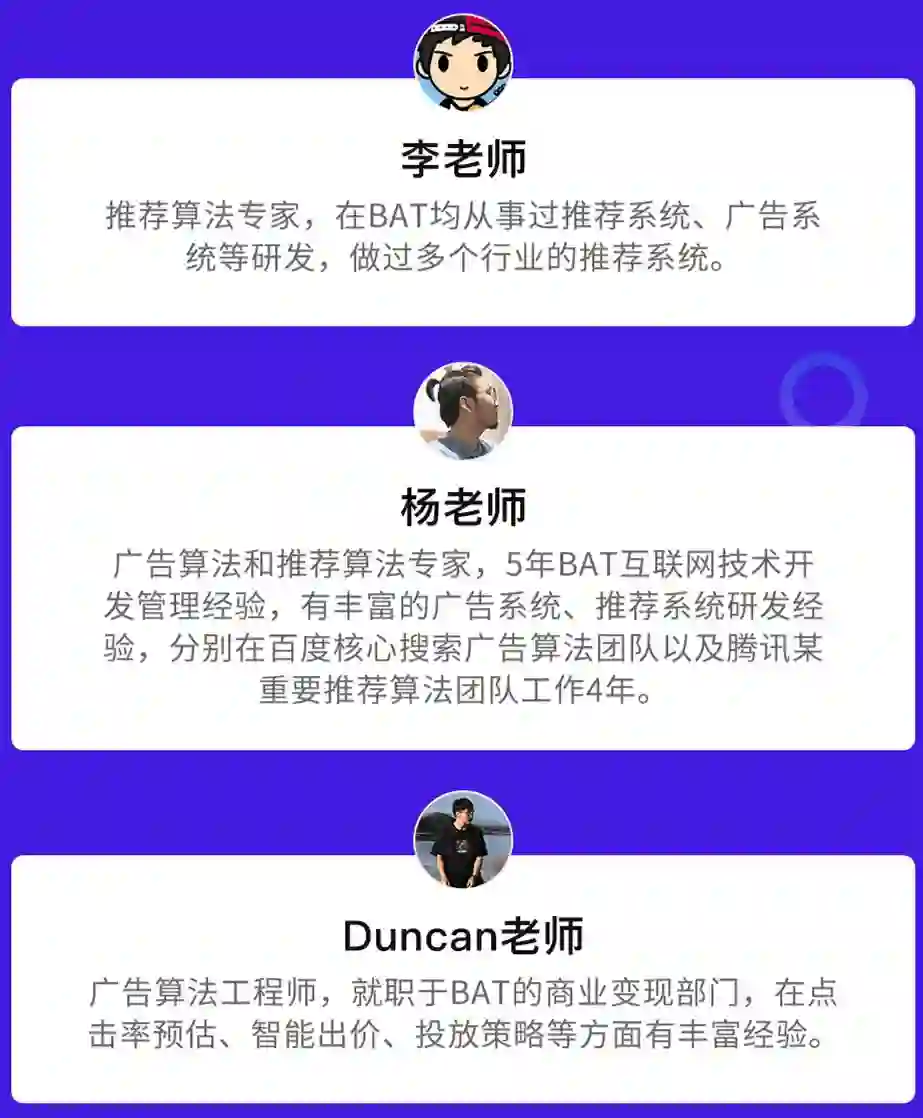 【推荐系统就业小班 第三期】 BAT大咖小班教学,保证就业! 由3位在BAT从业多年的团队核心大佬,定制化授课: ![]()