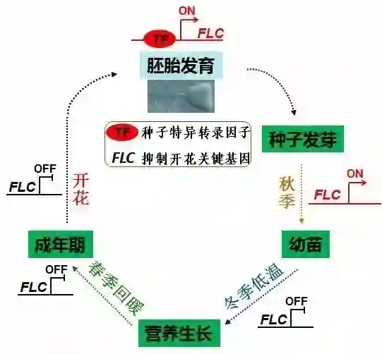 该课题组于2016年12月在Nature Genetics报道了模式开花植物拟南芥在营养生长阶段, 如何利用长期低温(冬季)沉默开花抑制关键基因FLC的表达并随后在常温维持其沉默(‘低温记忆’)的表观遗传机制,这一机理使植物具备了在春季开花的能力(春化作用)。在本研究中,该课题组进一步揭示了开花后的胚胎发育早期擦除‘低温记忆’,激活FLC基因使下一代又需经历冬季低温才能在春季开花的分子机制。