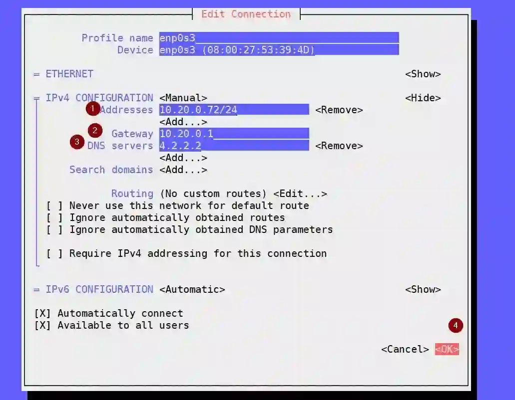 假设我们希望通过以下细节将静态 IP 地址分配给网卡 enp0s3 ,