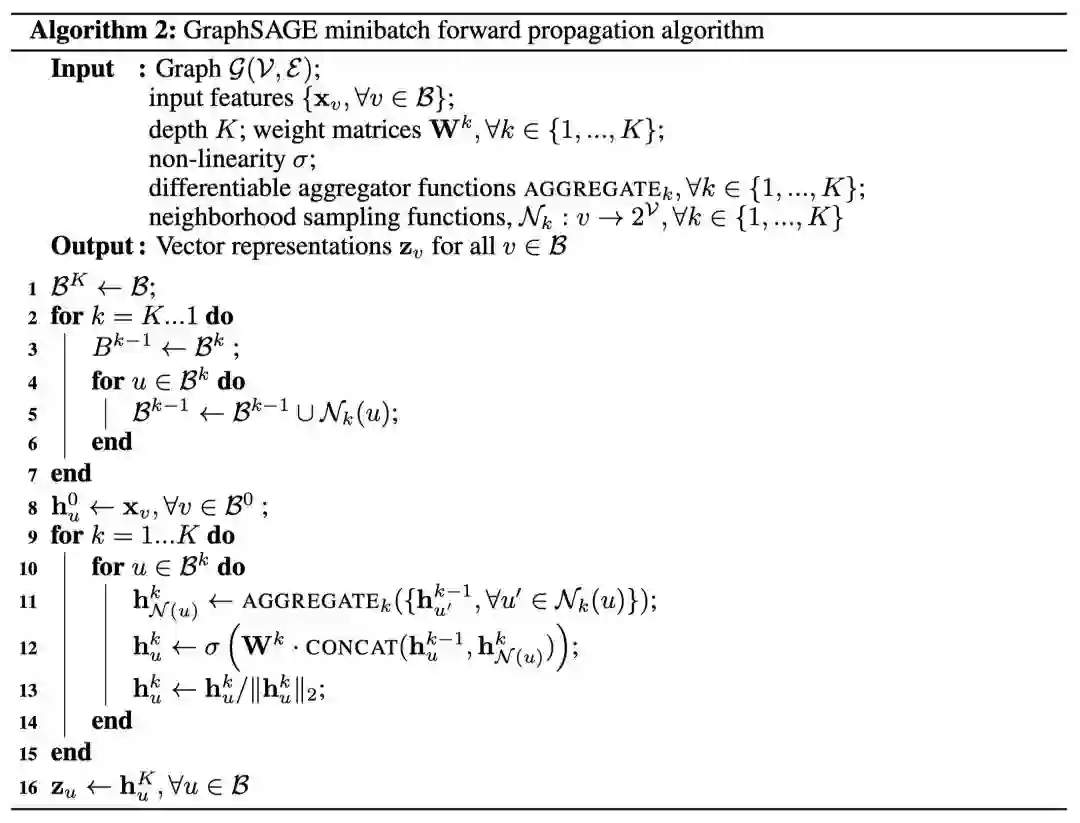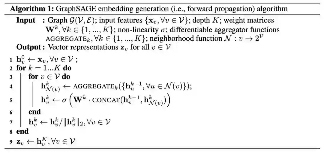 假设GraphSAGE已经训练好,我们可以通过以下步骤来获得节点embedding,具体算法请看下图的算法1。