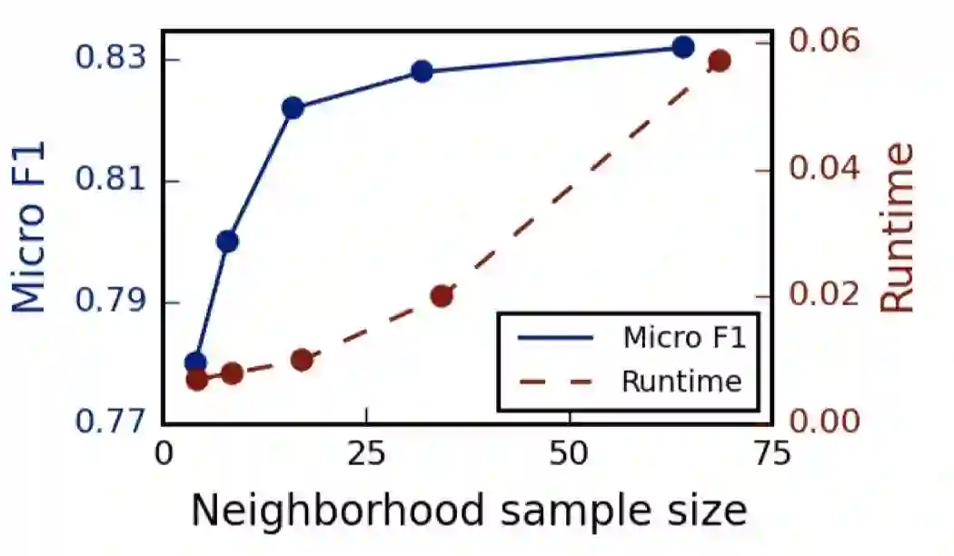 实验中也有关于邻居采样数量的对比,如下图,随着邻居抽样数量的递增,边际效益递减,而且计算时间也会增大。
