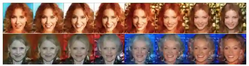 图 4:在 CelebA-HQ 上以 256×256 的分辨率得到的插值实验结果。最左边和最右边的图像是根据随机噪声随机采样得到的。中间的插值图像很平滑而且视觉质量很高。