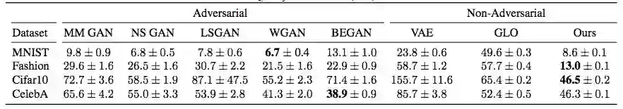 GAN 的缺陷让研究者开始探索用非对抗式方案来训练生成模型,GLO 和 IMLE 就是两种这类方法。Bojanowski et al. 提出的 GLO 是将训练图像嵌入到一个低维空间中,并在该嵌入向量输入到一个联合训练的深度生成器时重建它们。GLO 的优势有:1)无模式丢失地编码整个分布;2)学习得到的隐含空间能与图像的形义属性相对应,即隐含编码之间的欧几里德距离对应于形义方面的含义差异。但 GLO 有一个关键缺点,即没有一种从嵌入空间采样新图像的原则性方法。尽管 GLO 的提出者建议用一个高斯分布来拟合训练图像的隐编码,但这会导致图像合成质量不高。
