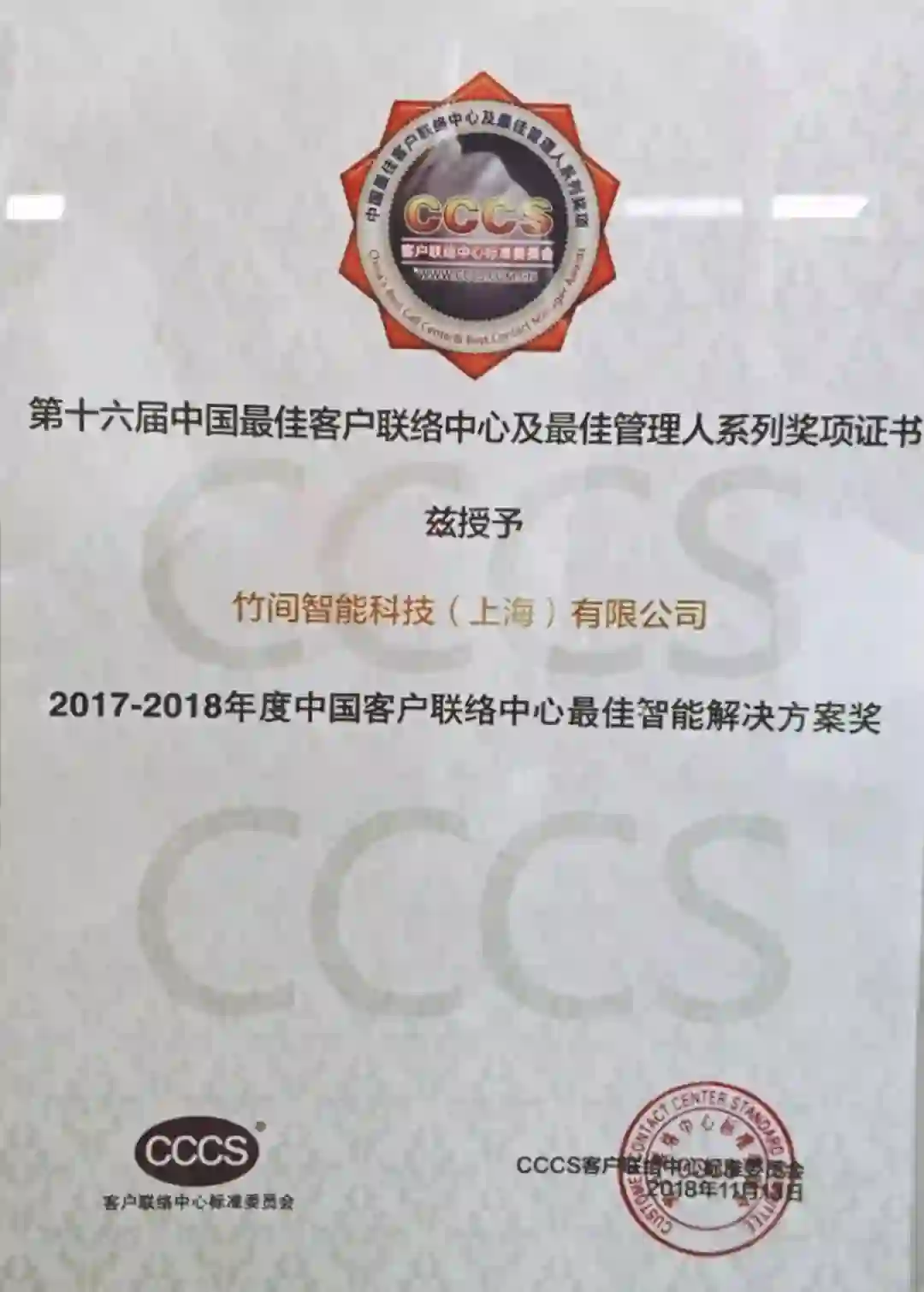 2018年11月13日,由CCCS客户联络中心标准委员会主办,以“科技赋能,从服务客户向服务用户迭代”为主题,于北京昆泰酒店召开第十六届中国客户联络中心高峰论坛,竹间智能获邀携AI Contact Center(AICC)解决方案亮相。