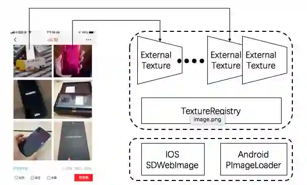 但是在图片这个场景下, 新的外接纹理方案下,一张图片在native端加载完成以后,立刻被转换成一个OpenGL的Texture,然后图片的资源马上被释放。当界面刷新时,对于同一张图片的重新渲染,IOSExternalTextureGL不需要再去做将数据(CVPixelBuffer或者SurfaceTexture)转换到Texture的逻辑,而是直接使用之前创建好的Texture。