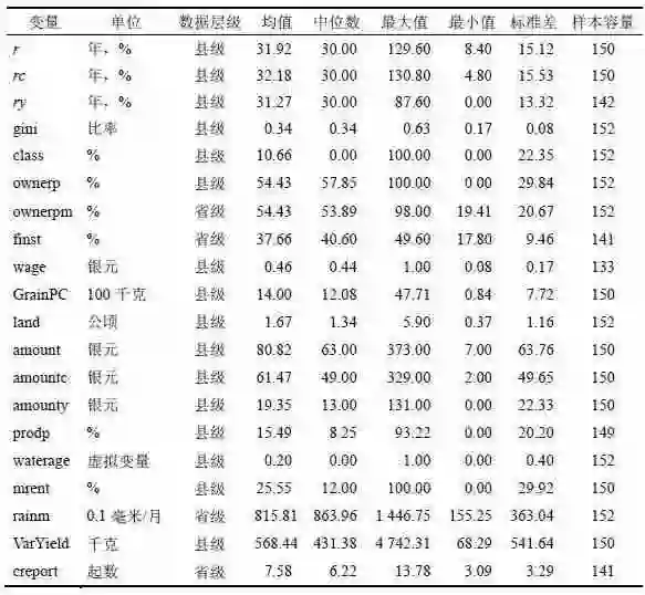 对于贫富差距这一关键的解释变量,当时并未估算基尼系数之类指标,也未提供可直接用于计算相关指标的收入分配数据,但报告了田场面积的组别分布。若设农户的劳动收入相对较平均,收入差距主要来源于土地经营,则可估算田场面积的基尼系数(gini)来近似地替代收入差距。至于放贷人的阶级属性,可觇于借贷来源一项,其分类为:同村人、亲友、富户、商人、农人、典买、店铺、城市或附近城市、地主、邻人、邻村、其他、未详。而在实业部中央农业实验所(1936)以《农情报告》系列发布的另一重要调查里,所取类别则为:银行、合作社、典当、钱庄、商店、地主、富农、商人。相比之下,前者可能更接近农村的实际,但是也更加模糊。因为,同村人、亲友、富户、地主等身份极可能是重合的,而从报告的数据来看,在发生重合时,调查人很可能只是权宜填取一种。例如,江苏武进在第二次调查时,借贷来源59%为亲友,38%为地主,第三次却骤变为亲友占80%,地主为0。这里假设填报中的权宜是随机的,则该项数据仍可用于回归,只是对估计结果的有效性应保持谨慎。又,按照传统的观点,富户、地主、商人的高利贷都可能具有剥削性,兹以它们的总和(class)来衡量放款人中“剥削阶级”的比重。此外,《农情报告》的前四项为非个人放贷,它的比例越高,意味着农村获得资金的渠道越多,也意味着传统的“剥削阶级”市场势力越受到限制。所以,为了弥补卜凯分类的不足,回归中亦参用《农情报告》的数据,将非个人放贷比例(finst)作为省级属性引入。
