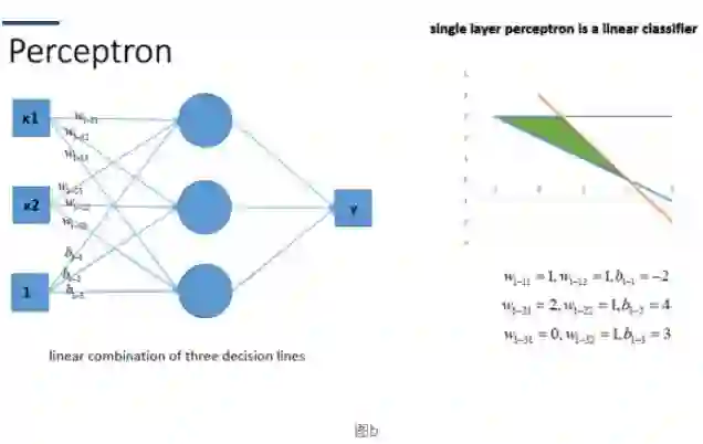 上图可看做普通的线性分类器,也就是线性回归方程。这个比较基础,效果如右图。当然有时候我们发现这样的线性分类器不符合我们要求时,我们很自然的想到那我们就加多一层,这样可以拟合更加复杂的函数,如下图a: