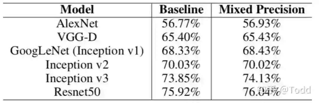 目前的不少GPU都有针对 fp16 的计算进行优化。论文指出:在近期的GPU中,半精度的计算吞吐量可以是单精度的 2-8 倍;从下图我们可以看到混合精度训练几乎没有性能损失。