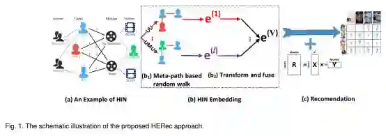 由于在数据异构性建模方面的灵活性,在推荐系统中采用异构信息网络(HIN)来描述复杂和异构的辅助数据,称为基于HIN的推荐。在HINs信息的提取和开发中,开发基于HIN的推荐方法是一项具有挑战性的工作。多数基于HIN的推荐方法依赖于基于路径的相似度,不能完全挖掘用户和项目的潜在结构特征。在本文中,作者提出了一个新的基于异构网络嵌入(heterogeneous network embedding)的方法,称为HERec。作者设计了一个基于元路径的随机游走策略来生成网络嵌入的有意义的节点序列。学习到的节点表示由一组融合函数进行转换,并集成到一个扩展的矩阵分解(MF)模型。扩展的MF模型与融合函数联合对评分预测任务进行优化。在三个真实数据集上的大量实验证明了该模型的有效性,证明了该模型对于冷启动问题的能力,并表明HINs转换的嵌入信息可以提高推荐性能。