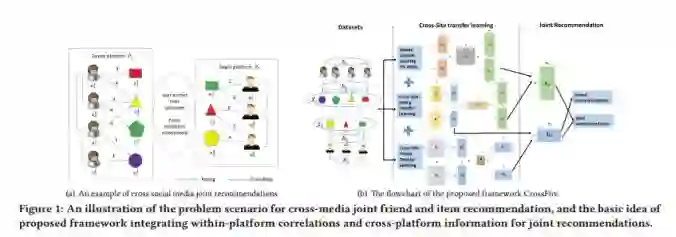 社交媒体网站上的好友和项目推荐是一项重要的任务,不论是对用户还是社交平台的提供者。然而,新推出的社交媒体网站的推荐任务极具挑战性,因为它们经常缺乏用户的历史数据,存在数据稀疏和冷启动问题。因此,开发辅助信息以帮助提高这些平台的推荐性能很重要。从其他成熟的社交平台转移的知识,通常需要重叠的用户或类似的项目来确保有效的知识转移,然而这些假设在实践中可能不成立,因为1)由于用户配置文件、内容和网络数据的异构性,重叠的用户集往往不可用,而且识别成本很高;2)不同的方案显示跨平台的项目属性导致属性值不一致、不完整及存在噪音。在两个社交媒体平台之间没有直接关联的情况下,如何传递知识仍然是一个挑战。我们可以利用的另一个辅助信息是平台内社会关系和打分偏好之间的互利性。用户-用户关系被广泛用作改进项目推荐的辅助信息,而如何利用用户-项目交互来推荐好友则有许多限制。为了应对这些挑战,作者提出了一种跨平台的好友和项目推荐框架(CrossFire),既能捕捉跨平台知识的转移,又能捕捉到用户与用户之间、用户项目交互之间的平台内相关性,在真实世界数据集上的实证结果证明了该框架的有效性。
