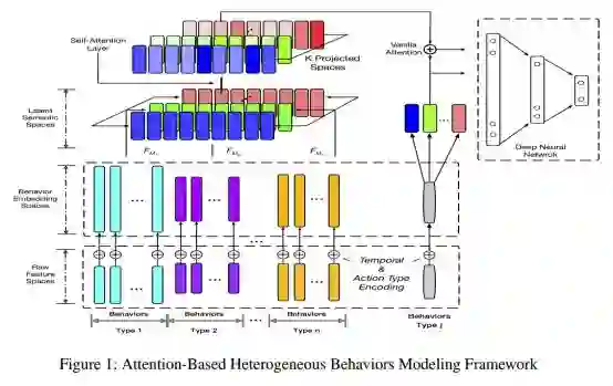 用户可以表示为他/她在历史过程中所做的事情。解决用户建模问题的一个常见方法是手工提取异构行为上的各种聚集特征,由于人类本能的限制,这些特征可能无法完全表示数据本身。最近的工作通常使用基于RNN的方法来给出一个行为序列的整体嵌入,然后可以被下游应用程序所利用。然而,这只能保存非常有限的信息。当下游应用程序需要方便建模的用户特征时,它可能会丢失用户特定的高度相关行为的完整性,并引入来自不相关行为的噪声。本文提出了一种基于注意力(Attention)的用户行为建模框架ATRank,主要用于推荐任务。该模型考虑了异构用户行为,将所有类型的行为投影到多个潜在的语义空间中,通过自我注意(Self-attention)在这些行为之间产生影响。然后,下游应用程序可以通过普通注意力(Vanilla attention)使用用户行为向量。实验结果表明,ATRank算法具有更好的性能和更快的训练速度。作者进一步探索了ATRank 并使用了一个统一模型同时预测不同类型的用户行为,显示出与高度优化的单个模型具有可比性的性能。