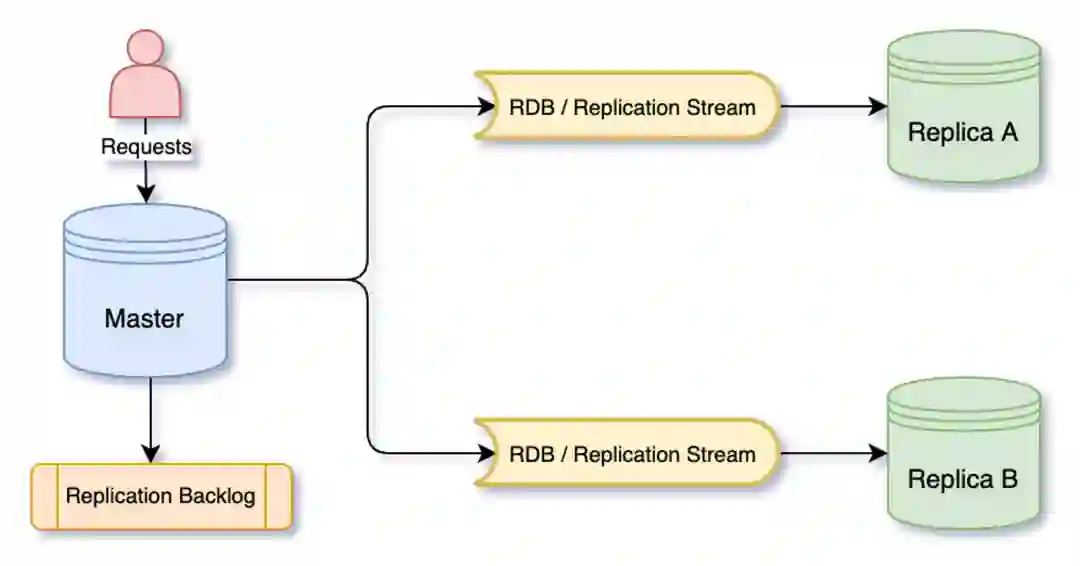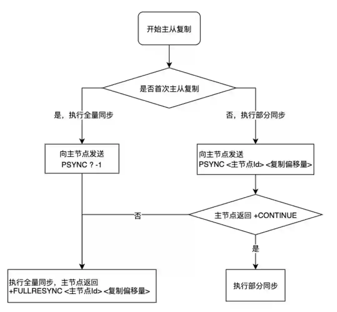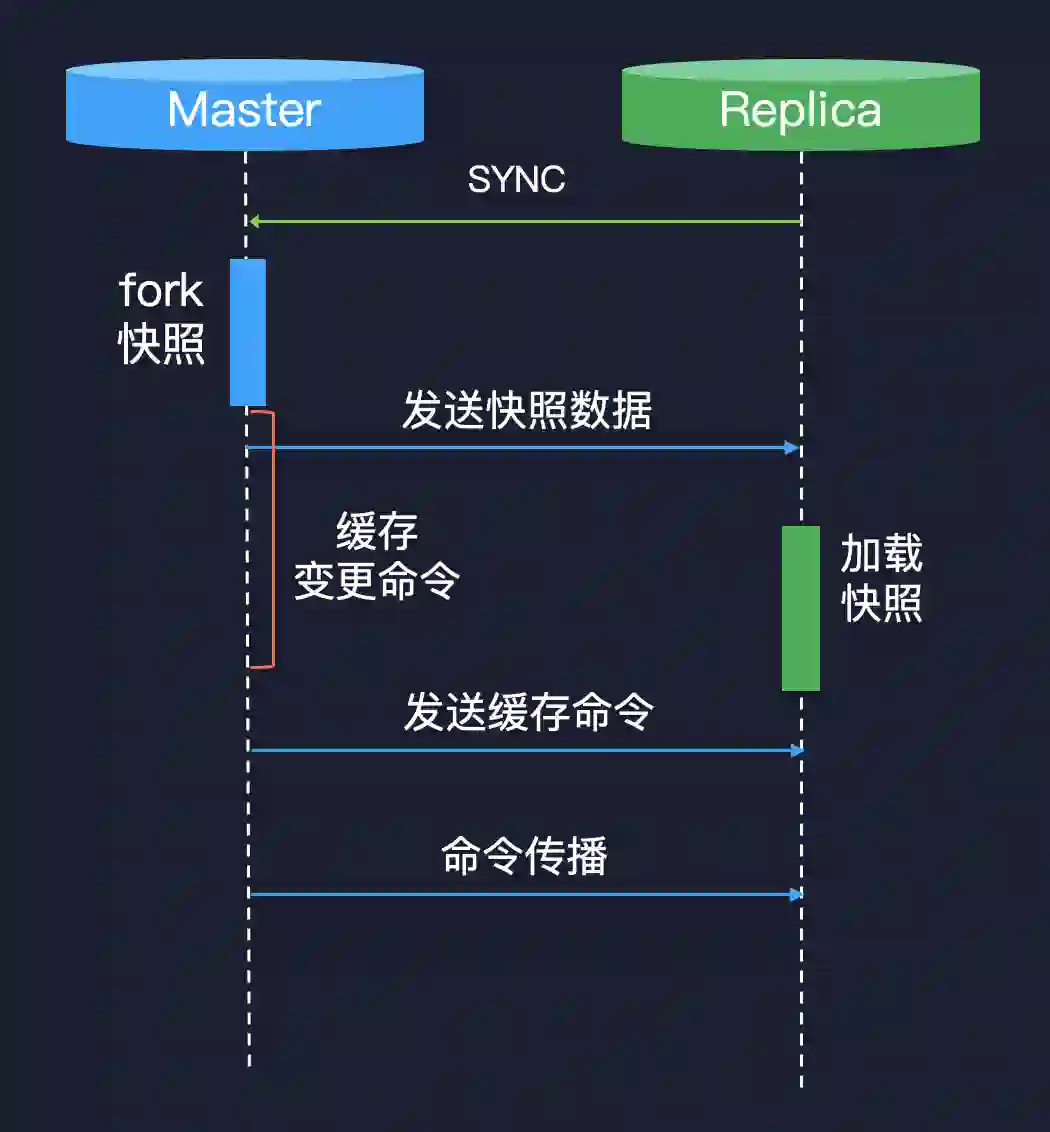 从库发送一个 SYNC 请求给主库,主库就会 fork 一个进程,产生数据快照,当这个数据快照产生完成之后发送给从库,注意这里是数据快照,产生完之后再发给从库,从库也是接收完这个快照之后再加载快照。因为在这个期间主库肯定又会积累很多命令,所以它会将缓存的命令再次发送给从库,之后就进入了一个命令的传播阶段。