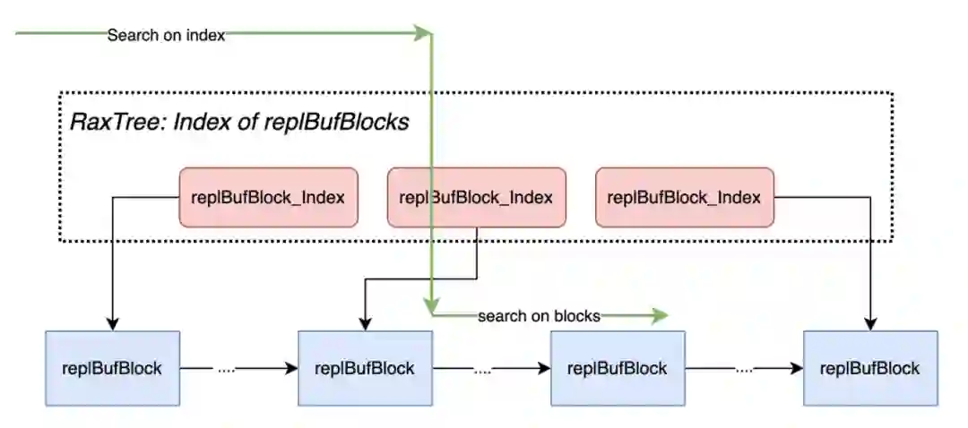 但是这个方案仍然有几个问题需要解决,我们知道部分重同步的时候,在 Backlog 中要找到对应的数据内容,现在 Backlog 只是引用复制缓冲区,那共享的复制缓冲区,我们如何实现查找呢?这个链表上的节点非常多,可能是几万个,甚至是几十万个,我们如何高效地查找呢?