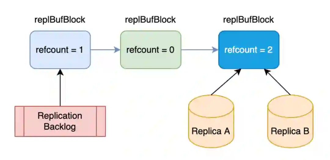如图所示,Backlog 它引用了第一个 block,它的 count 就是 1,然后从库 A 和 B 它们都引用了第三个 block,它的 count 就是 2。这样我们就在一条链表上,不同的从库引用不同的节点,就实现了一个共享复制缓冲区的方案。