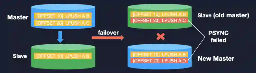 还是看一下这个例子:现在有一主一从,你在主库上写了两条数据,LPUSH A、C,但是由于同步的延迟,在从库上只有一条,就是 LPUSH A、B,当 failover 后从库成为新主,它肯定会接收新的业务请求,比如它写入了一条 LPUSH A、D,此时我们想让旧主跟新主建立主从复制,这样是可以进行增量同步的吗?
