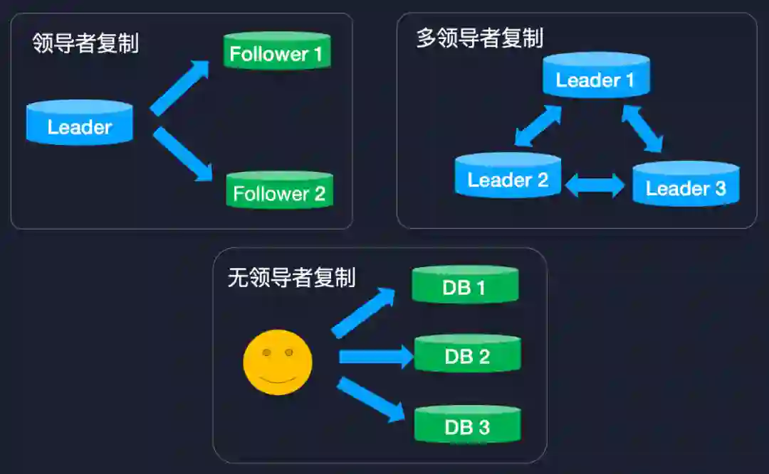 还有一种方式是基于无领导者的复制,就是数据节点之间不会进行同步,而是由用户来写入的,用户的写入一般会基于 Quorum 的原则,比如说用户会写入超过一半的节点,读取的时候也会读超过一半的节点。