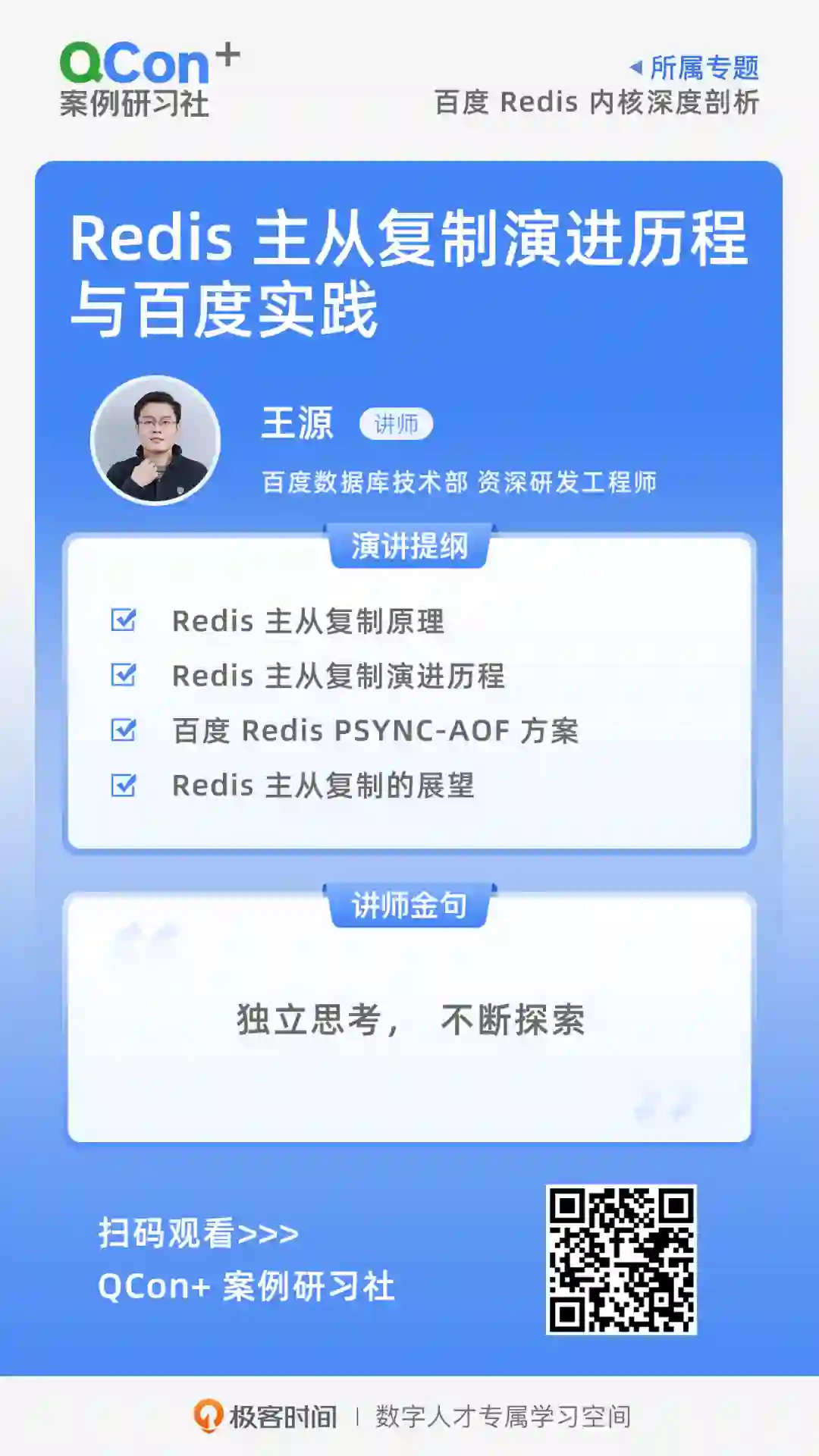 最后我有一句话和你分享:独立思考、不断探索。我们发现 Redis 主从复制的历程,也是发现问题去解决问题。我们遇到了很多问题,但是通过深挖找到解决的思路,然后去探索,最后将这个问题不断地优化得以解决,也让我们应对的场景越来越多。