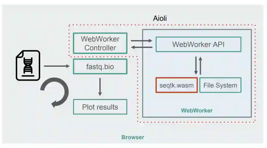然后,我们让 Worker 运行 seqtk 命令来处理事先挂载好的文件。在 seqtk 运行完成之后,Worker 通过一个 Promise 将结果发送回主线程,主线程在接收到消息之后使用结果数据更新图表。与 JavaScript 实现一样,我们每次只处理一个数据块。