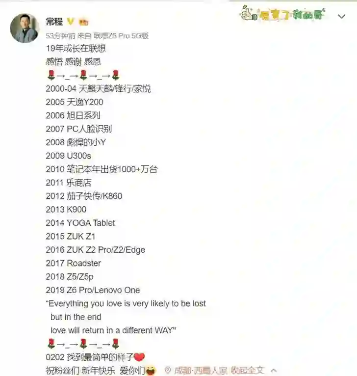 【联想内部人士:手机掌门人常程已离职,今晨官宣】12月30日晚间有网友爆料称,联想集团副总裁、手机业务负责人常程已于12月18日离职,与柳传志退休为同一天。今日早间,常程在微博宣布离职。距了解,常程于2000年加入联想,担任笔记本事业部研发总监,负责联想台式电脑、笔记本电脑和智能手机的研发工作;2011年,任联想集团副总裁兼移动端到端软件平台总经理,转身移动互联业务,打造联想乐商店和茄子快传 ,孵化并研发联想Yoga平板电脑和联想K900智能手机;2014年12月,成为神奇工场联合创始人。2015年6月,出任ZUK CEO。