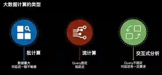 最后一种是交互式分析,这种类型的大数据计算的特点是用户的查询query是不固定的,这些query往往是由用户随机的发出的。虽然查询不固定,在这种场景下,用户对查询的返回时间是有一定的要求的,这个时间介于批处理和流处理之间,越快越好,最好能做到秒级。
