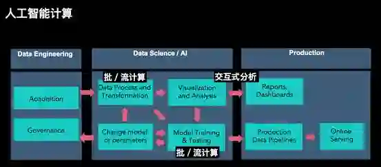 人工智能计算的种类很多,但是整体架构大多和上图所描述的类似。一个常见的ML pipeline通常涉及一系列的数据预处理、特征提取和转换、模型训练以及验证。如果验证后的效果符合预期,就可以将模型推到线上服务。如果不符合预期,算法工程师就需要调整算法模型或者参数,然后再做一次模型的训练和验证,直到对结果满意后,再将训练好的模型推上线服务。整个计算过程可以是对一个确定大小的数据按照批计算模式计算,也可以接入实时数据按照流计算模式进行计算。上面这个pipeline是人工智能计算最基础的流程,如果算法工程师对数据以及业务特点非常熟悉,他们就能设计出合理的算法模型和参数。但是往往更常见的情况是,算法工程师需要分析工具帮助他们理解数据。只有在很好地理解了数据特点之后,才能提取出更有用的特征,设计出更好的模型。因此,如下图所示,做好人工智能计算,不可或缺的一部分就是交互式分析。有了交互式分析,算法工程师可以对数据做各种ad-hoc query,从而帮助他们更好地理解数据。